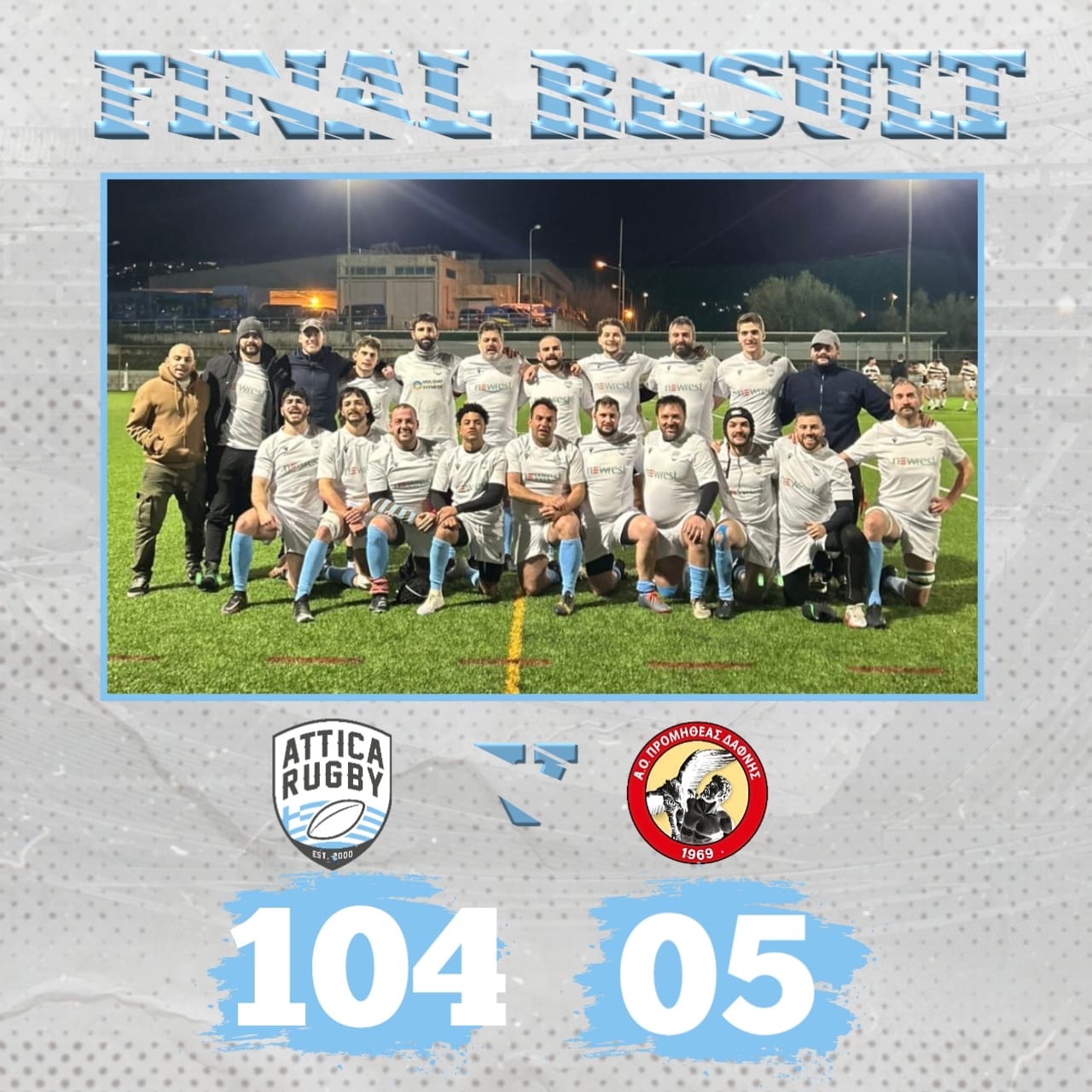 In a dominant home performance at Atlas Arena, Attica secured a massive 104–5 victory over Prometheas. The match was a display of relentless offensive pressure, with Attica crossing the try line fourteen times throughout the eighty minutes. The scoring was opened early by a powerful run from the home side’s front row, setting the tone for a first half that saw Attica pull away to a significant lead.